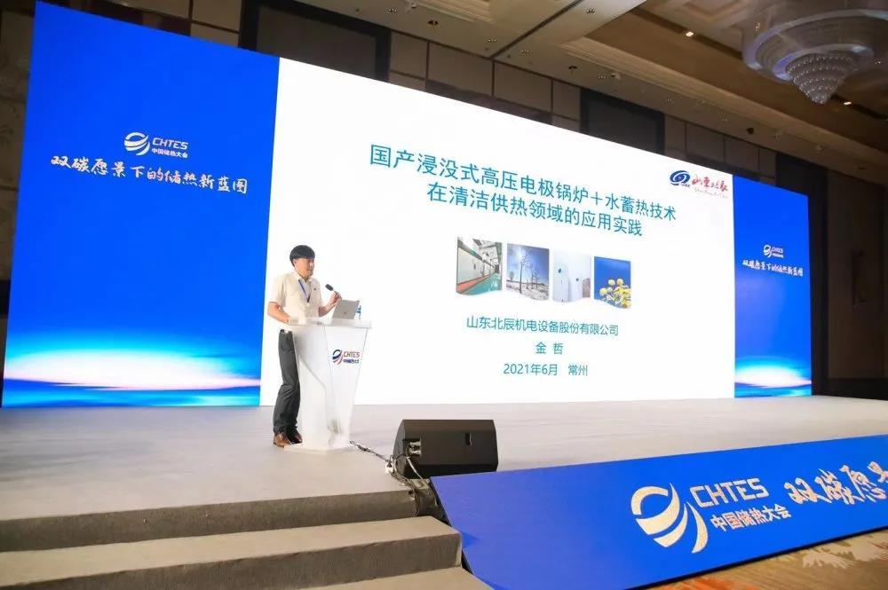 主题演讲环节中,金总做了主题为《国产浸没式高压电极锅炉+水蓄热技术在清洁供热领域的应用实践》的报告,详细介绍了在新一代电力系统下,山东北辰高/低压电极锅炉+水蓄热、锅炉+熔盐蓄热、余热利用等技术的发展及应用。