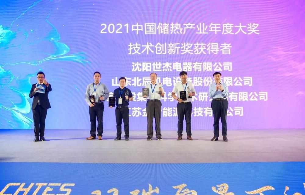 山东北辰的展位也迎来了非常多储热行业的合作伙伴和客户,公司参会员工积极与前来咨询的行业组织、科研院所、兄弟单位等,从技术到市场,再到行业政策进行了集中、全面的交流,深入探讨了电极锅炉+水蓄热技术、熔盐储热技术等在清洁供热市场的应用价值和发展之道。在此次会议上,山东北辰荣获“2021中国储热产业年度大奖——储热技术创新奖”。