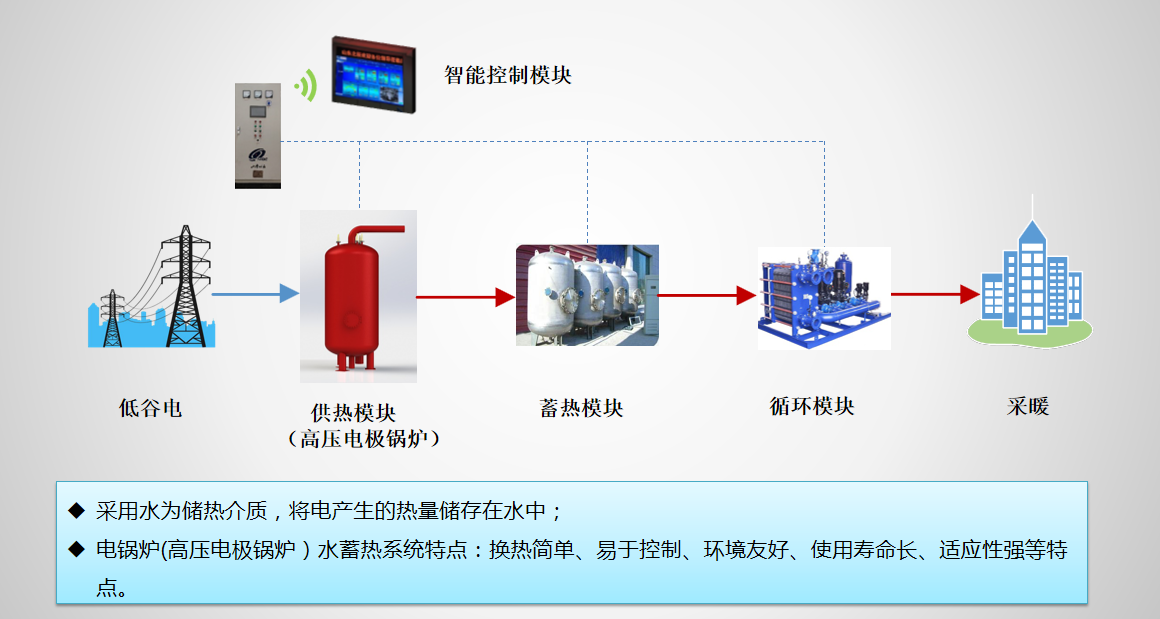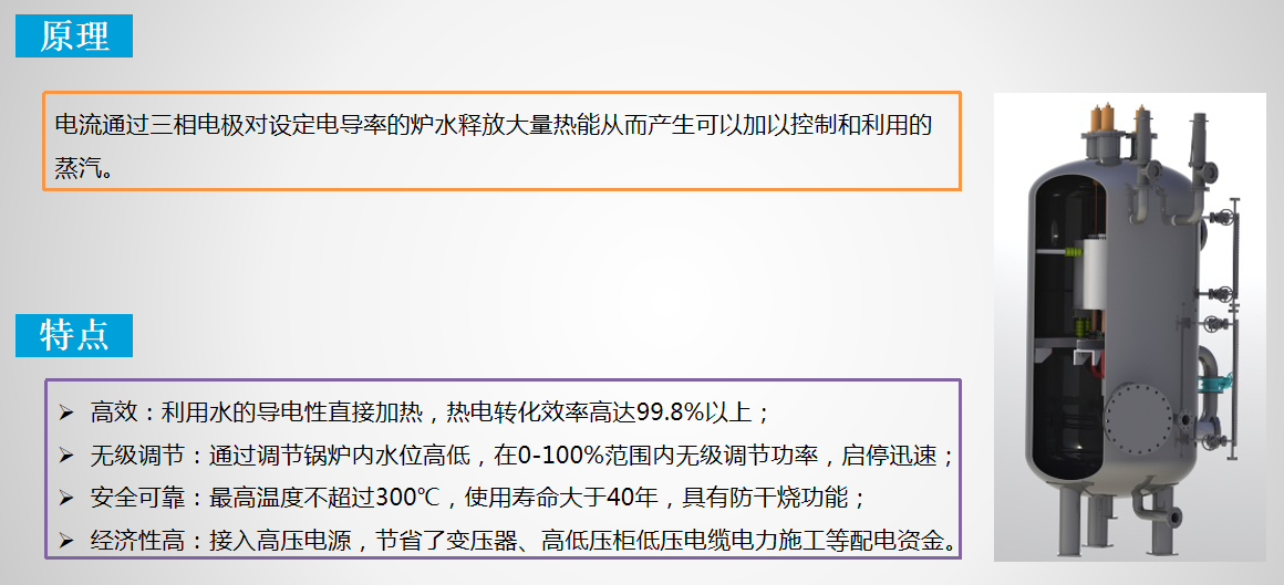 原理:电极浸没在一定电导率的水中,通电后,由于水的导电性,产生电流,生热将水变成高温水或蒸汽,通过锅炉外置换热装置可储存,也可直接供给用户。